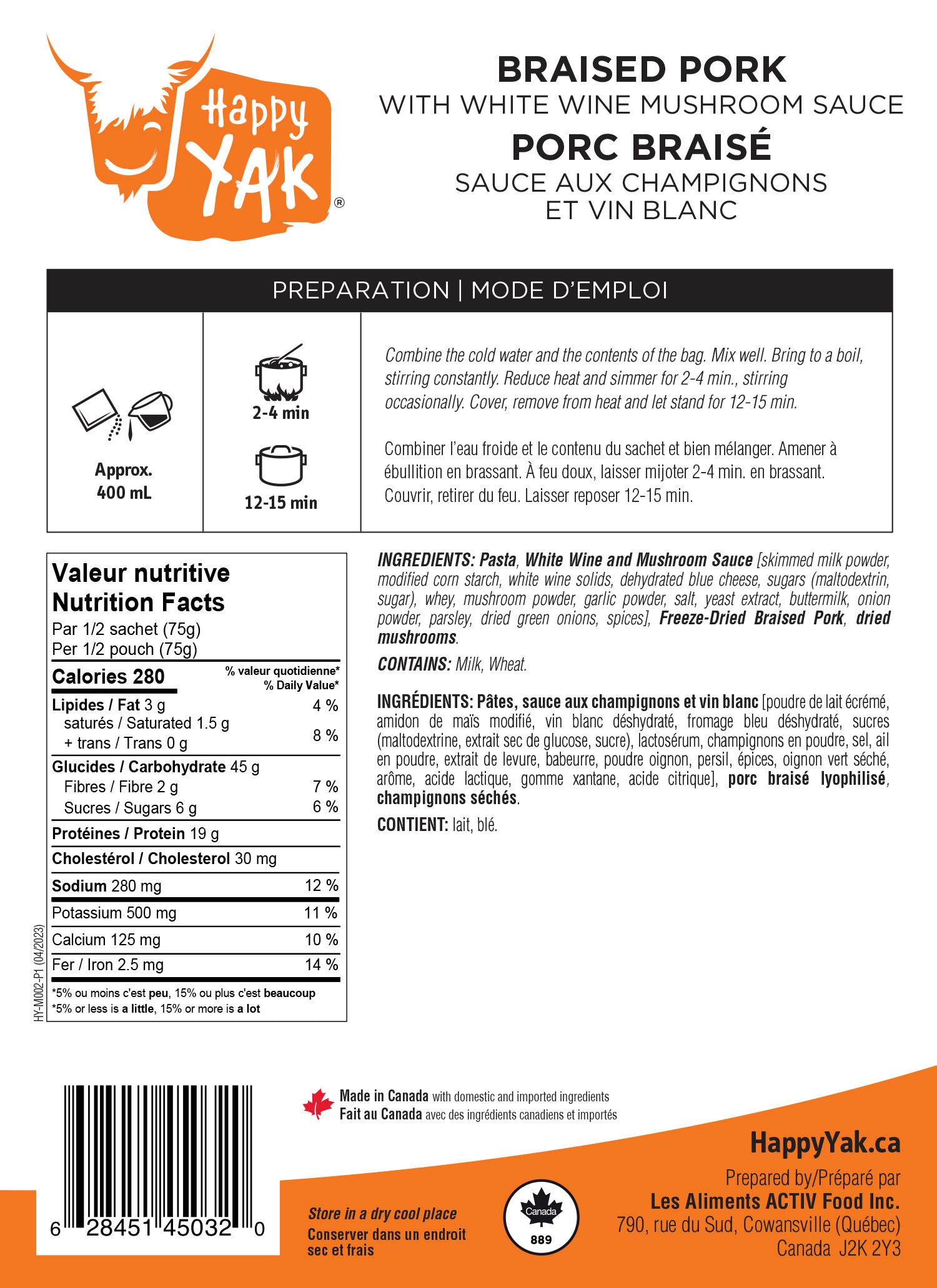 Happy Yak braised pork is a scrumptious meal. Enhanced with a smooth creamy wild mushroom and white wine sauce, this meal is simple and easy to prepare. It contains 40 g of protein which providing you the energy you need for your activities. Pour the contents of the pouch into a pot, cook as indicated and enjoy!